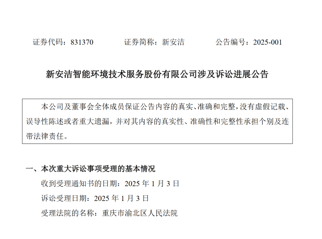 新安洁(831370)发布涉及诉讼进展公告。公告指出,重庆暄洁再生资源利用有限公司(公司全资子公司)于2025年1月3日向重庆市渝北区人民法院提起诉讼,因被告廖仁兵未能完成业绩承诺,导致公司投资利益受损。根据协议,廖仁兵需对湖北暄立环保科技有限公司在2022年至2024年期间每年实现的营业收入不低于2亿元、净利润不低于400万元进行承诺,若未达标需进行现金补偿。