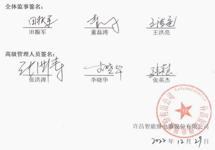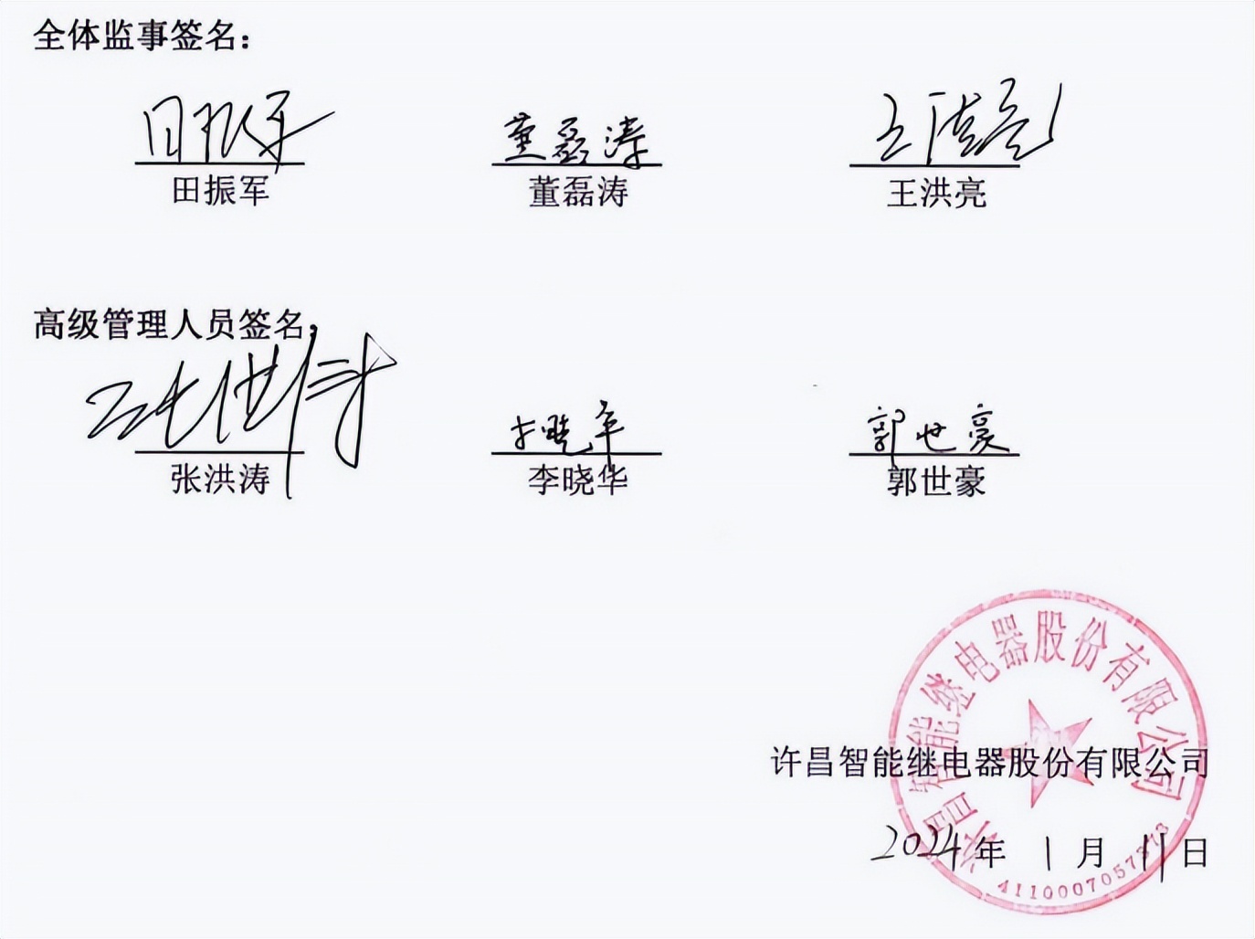 许昌智能招股书(申报稿)于2022年12月签署,招股书(注册稿)于2024年1月签署,其中财务总监李晓华、监事董磊涛在两版招股书中的签名笔迹完全不同。而且李晓华、董磊涛在招股书(注册稿)中的签名笔迹与公司董事会秘书郭世豪高度相似。
