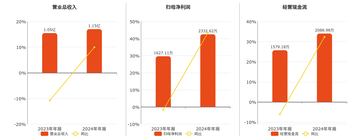 公司营业总收入为1.15亿元,在已披露的同业公司中排名第18。归母净利润为2332.62万元,在已披露的同业公司中排名第17。经营活动现金净流入为2088.98万元,在已披露的同业公司中排名第18。