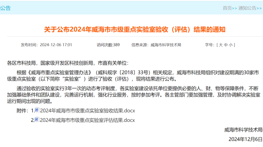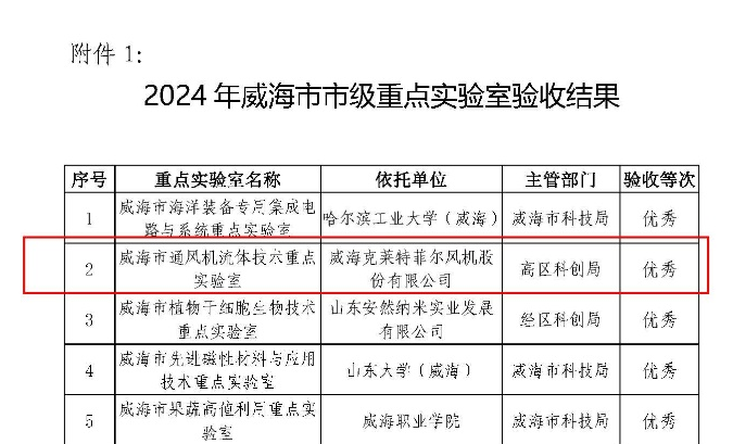 日前,威海市科学技术局公布了2024年威海市市级重点实验室验收(评估)结果,公司搭建的“威海市通风机流体技术重点实验室”依托优异的研发成绩在全市考评中脱颖而出,获得“优秀”等级。