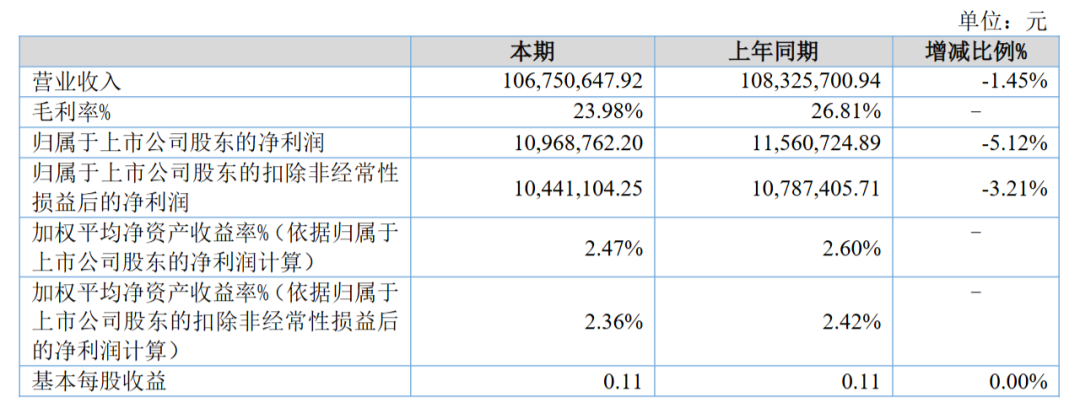 报告期内,公司实现营业收入10675.06万元,归属于母公司所有者的净利润1096.88万元,归属于上市公司股东的扣除非经常性损益后的净利润1044.11万元,分别较上年同期下降1.45%、5.12%和3.21%。