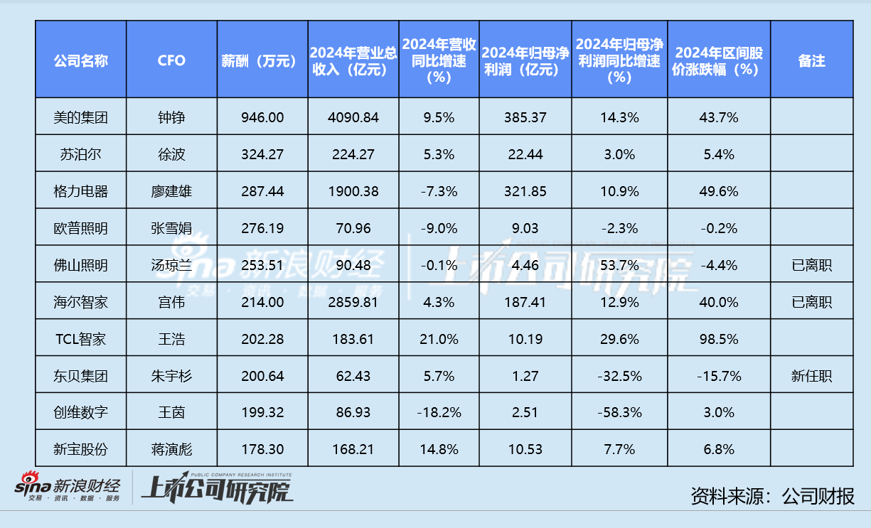 美的集团CFO钟铮以946万元薪酬稳坐第一,约为第二名苏泊尔CFO徐波2024年薪近3倍。此外,她还通过员工持股计划持有公司股份,具体持股比例未披露。财报显示,钟铮现年43岁,于2002年加入公司,曾任金融中心、部品事业部财经总监、公司审计总监等职务,现任公司副总裁、首席财务官兼财务总监。