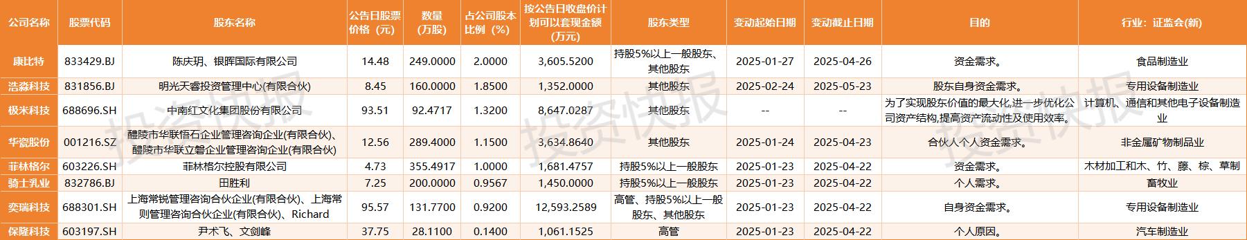 此外,极米科技(688696.SH)、华瓷股份(001216.SZ)、菲林格尔(603226.SH)以及骑士乳业(832786.BJ)等多家上市公司也发布了股东减持股份的公告。这些减持计划涉及的股份数量从数十万股到数百万股不等,按公告日收盘价,其套现金额最低为1450万元,最高为8647.03万元。减持目的主要是自身资金需求及经营业务需要等。