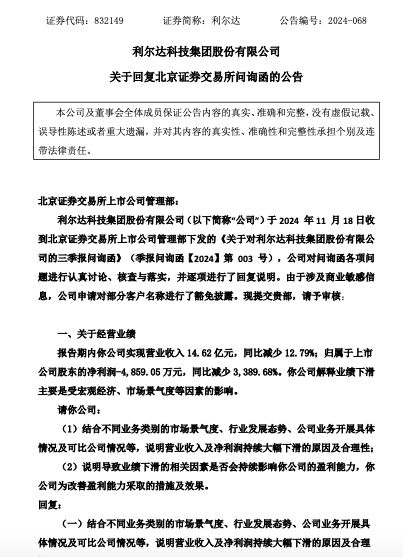 11月18日晚间,北京证券交易所下发关于对利尔达科技集团股份有限公司(以下简称“利尔达”或“公司”)的三季报问询函。报告期内利尔达实现营业收入14.62亿元,同比减少12.79%;归属于上市公司股东的净利润-4,859.05万元,同比减少3,389.68%。问询函要求利尔达结合不同业务类别的市场景气度、行业发展态势、公司业务开展具体情况及可比公司情况等,说明营业收入及净利润持续大幅下滑的原因及合理性等。