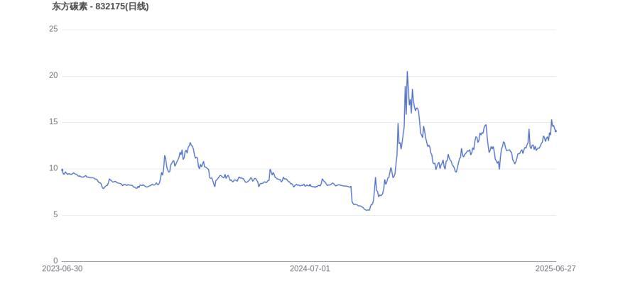 从上市首日至今,东方碳素的市值实现了0.42倍的增长。2024年11月21日,东方碳素的市值巅峰达到24.84亿元,股价也顺应升至20.87元。而至6月27日收盘,东方碳素的股价为14.05元,市值为16.72亿元,相比峰值时期市值减少8.12亿元,市值蒸发了32.68%。