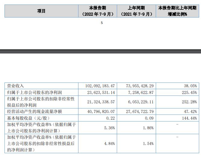 第三季度实现加速跑,营收为1.02亿元,同比增长38.05%。净利润为2362万元,同比增长225.45%。