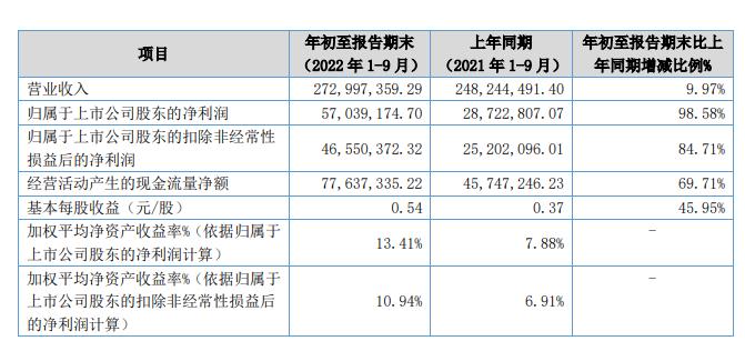 挖贝网 10月28日消息,利通科技(832225)发布前三季度业绩报告,实现营收2.73亿元,同比增长9.97%。归属于上市公司股东的净利润5704万元,同比增长98.58%。