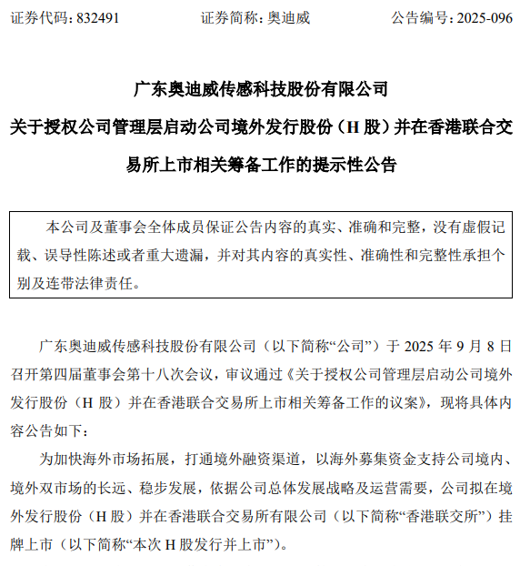奥迪威9月8日晚间公告,为加快海外市场拓展,打通境外融资渠道,以海外募集资金支持公司境内、境外双市场的长远、稳步发展,依据公司总体发展战略及运营需要,公司拟在境外发行股份(H股)并在香港联交所挂牌上市。
