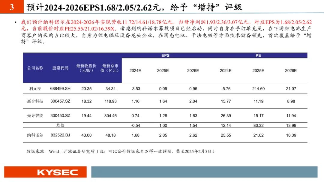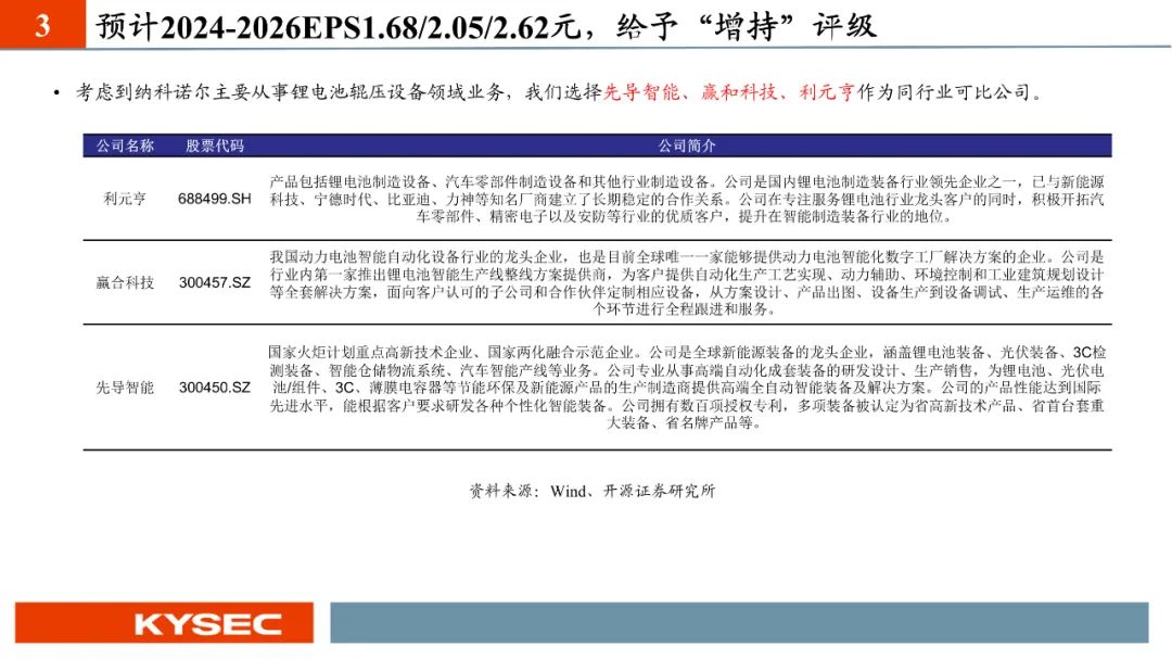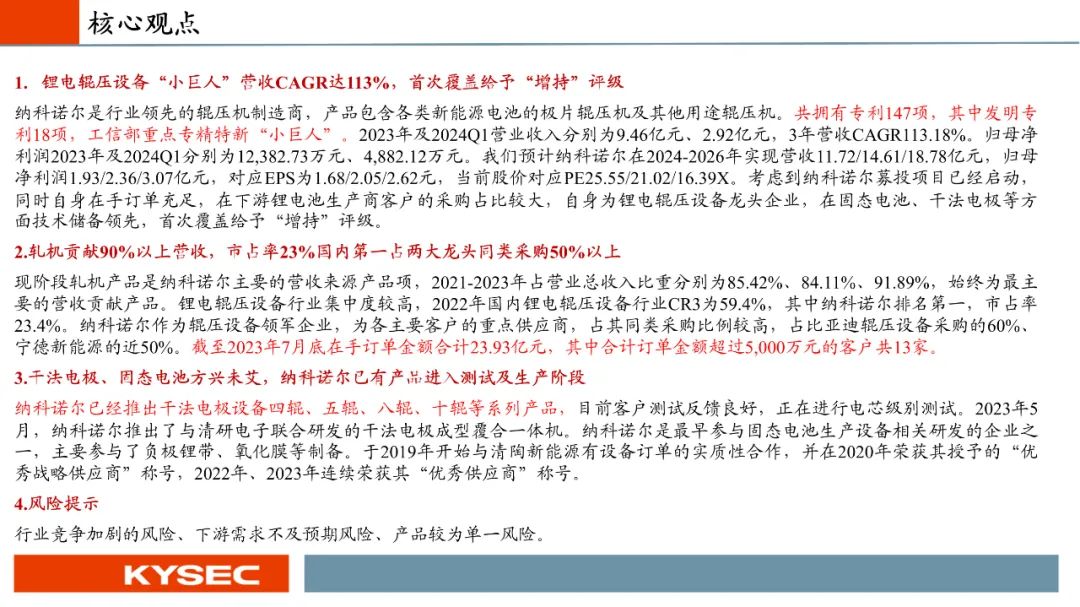 纳科诺尔是行业领先的辊压机制造商,产品包含各类新能源电池的极片辊压机及其他用途辊压机。共拥有专利147项,其中发明专利18项,工信部重点专精特新“小巨人”。我们预计纳科诺尔在2024-2026年实现营收11.72/14.61/18.78亿元,归母净利润1.93/2.36/3.07亿元,对应EPS为1.68/2.05/2.62元,当前股价对应PE25.55/21.02/16.39X。考虑到纳科诺尔募投项目已经启动,同时自身在手订单充足,在下游锂电池生产商客户的采购占比较大,自身为锂电辊压设备龙头企业,在固态电池、干法电极等方面技术储备领先,首次覆盖给予“增持”评级。