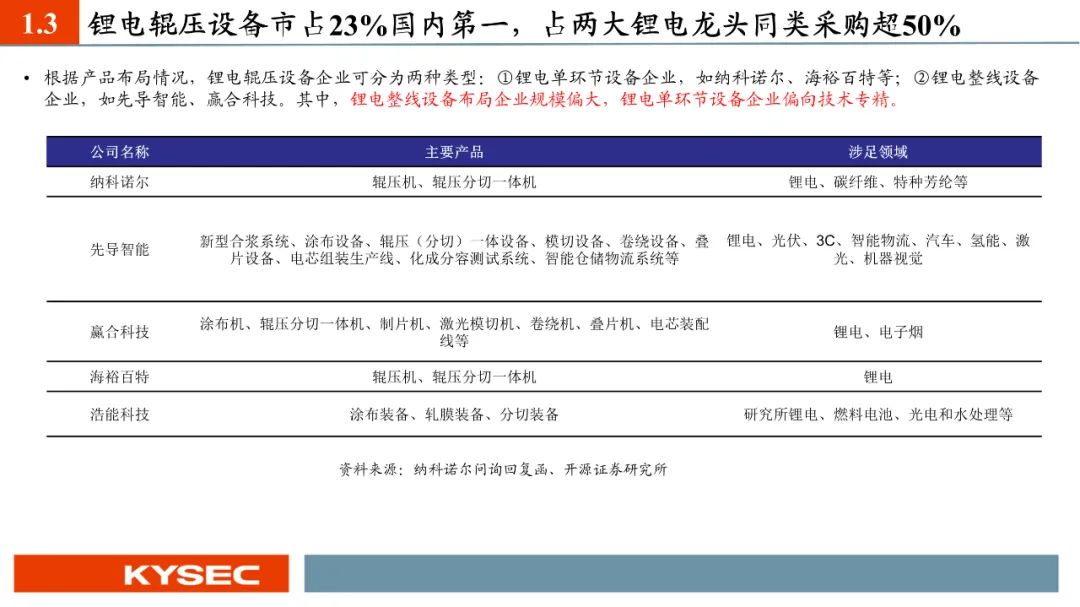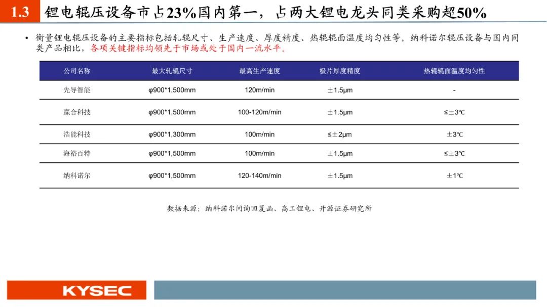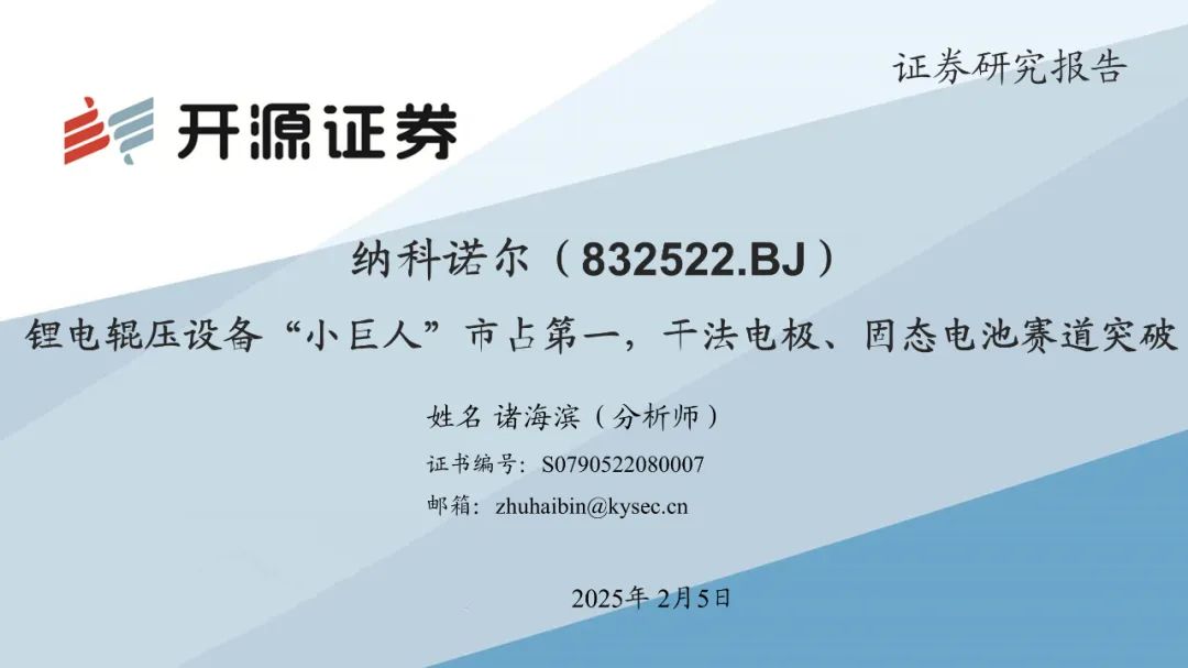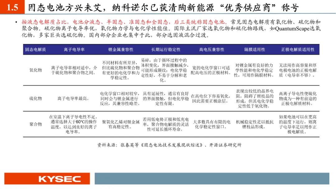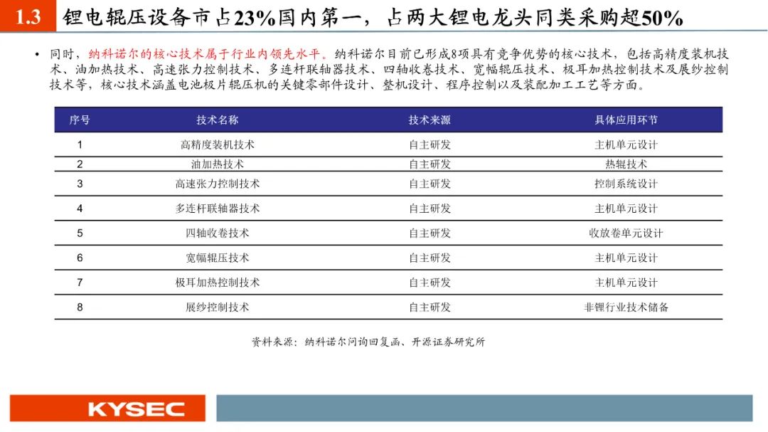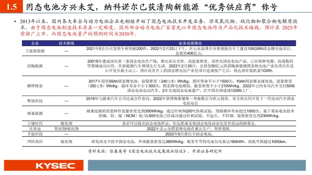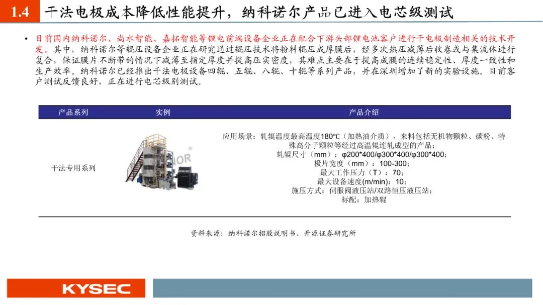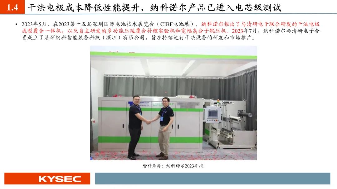 纳科诺尔已经推出干法电极设备四辊、五辊、八辊、十辊等系列产品,目前客户测试反馈良好,正在进行电芯级别测试。2023年5月,纳科诺尔推出了与清研电子联合研发的干法电极成型覆合一体机。纳科诺尔是最早参与固态电池生产设备相关研发的企业之一,主要参与了负极锂带、氧化膜等制备。于2019年开始与清陶新能源有设备订单的实质性合作,并在2020年荣获其授予的“优秀战略供应商”称号,2022年、2023年连续荣获其“优秀供应商”称号。