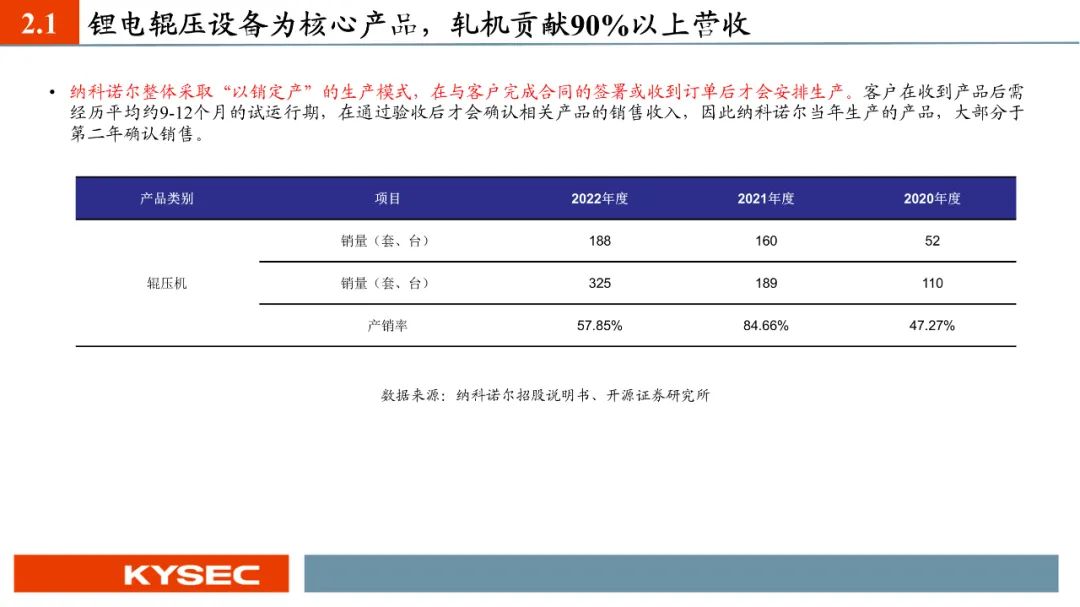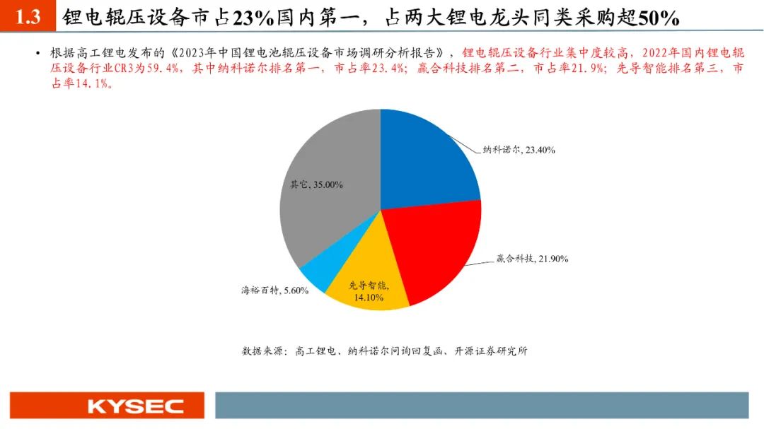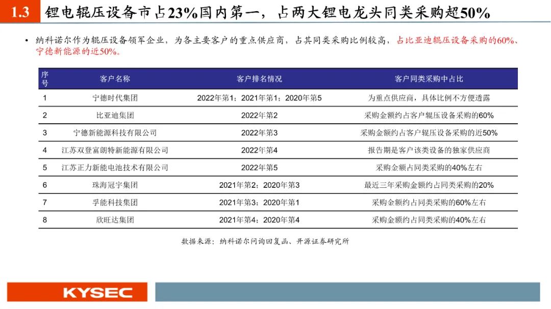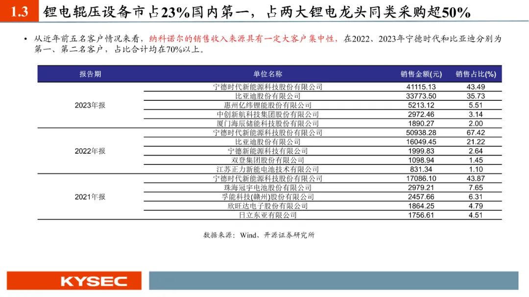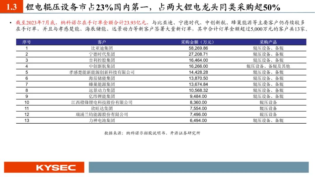 现阶段轧机产品是纳科诺尔主要的营收来源产品项,2021-2023年占营业总收入比重分别为85.42%、84.11%、91.89%,始终为最主要的营收贡献产品。锂电辊压设备行业集中度较高,2022年国内锂电辊压设备行业CR3为59.4%,其中纳科诺尔排名第一,市占率23.4%。纳科诺尔作为辊压设备领军企业,为各主要客户的重点供应商,占其同类采购比例较高,占比亚迪辊压设备采购的60%、宁德新能源的近50%。截至2023年7月底在手订单金额合计23.93亿元,其中合计订单金额超过5,000万元的客户共13家。