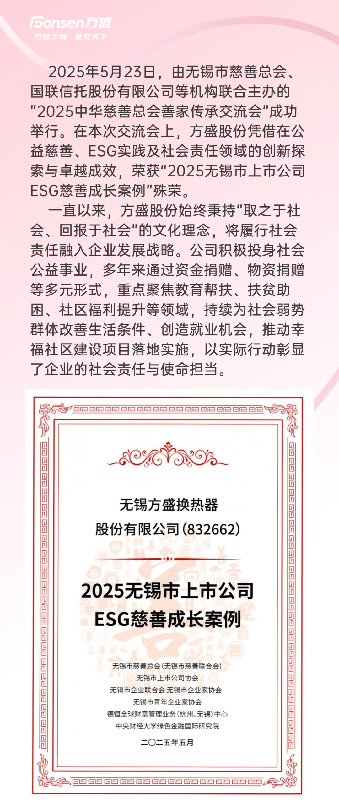 方盛股份荣获“2025无锡市上市公司ESG慈善成长案例”殊荣