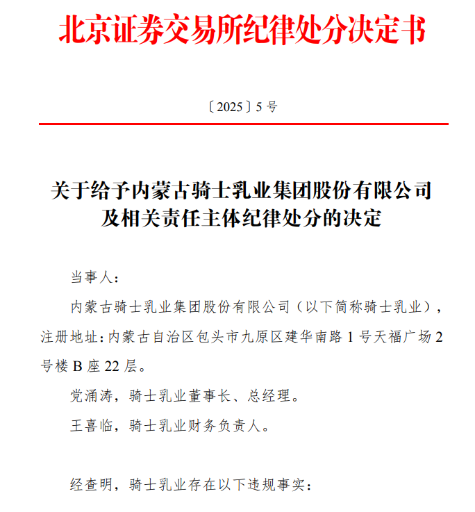 4月22日,因业绩预告信息披露不准确且未及时修正,骑士乳业被北京证券交易所给予通报批评的纪律处分,并记入证券期货市场诚信档案。公司董事长党涌涛、财务负责人王喜临因未能勤勉尽责,亦被通报批评。