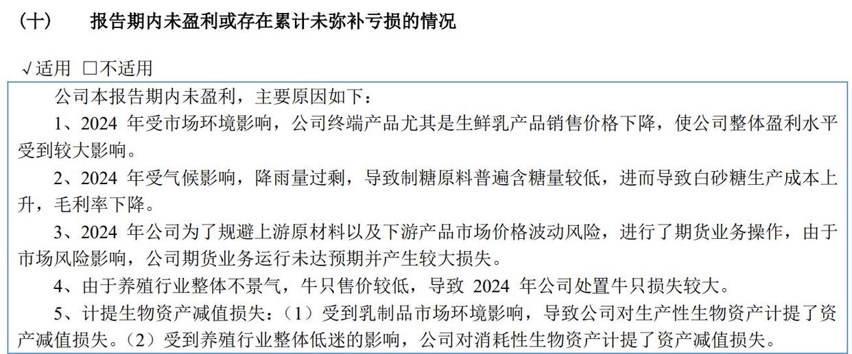 此外,2024年骑士乳业为了规避上游原材料以及下游产品市场价格波动风险,进行了期货业务操作,由于市场风险影响,公司期货业务运行未达预期并产生较大损失,这也是导致业绩亏损的重要原因之一。