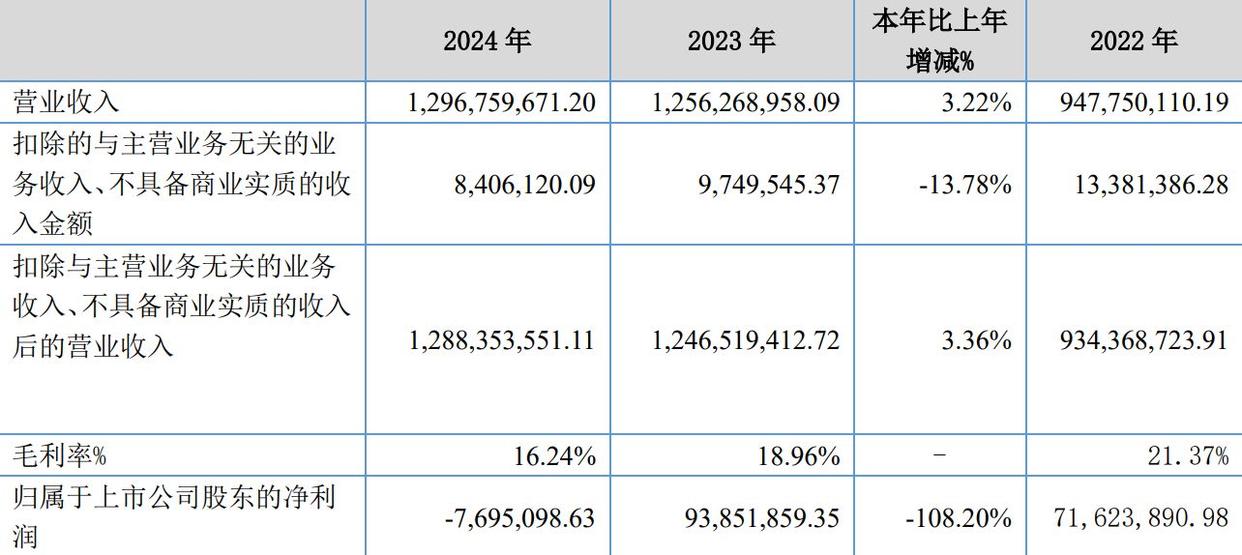 财报显示,2024年营业收入为12.97亿元左右,同比仅大致增长3.2%,增速大幅放缓;而归属于上市公司股东的净利润更是由盈转亏,达到亏损769.51万元左右,同比大致下降108.2%。