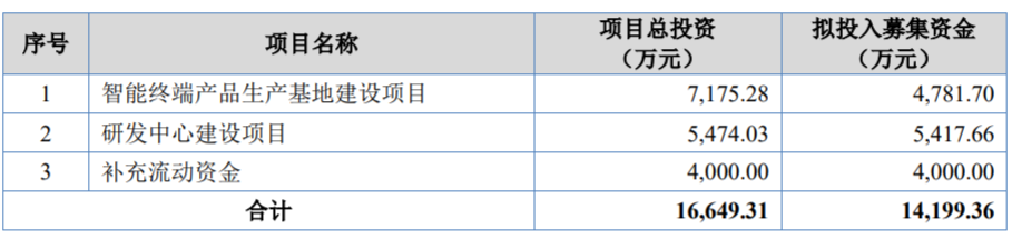慧为智能本次首次公开发行股票所募集的资金扣除发行费用后,将投资于智能终端产品生产基地建设项目、研发中心建设项目、补充流动资金。