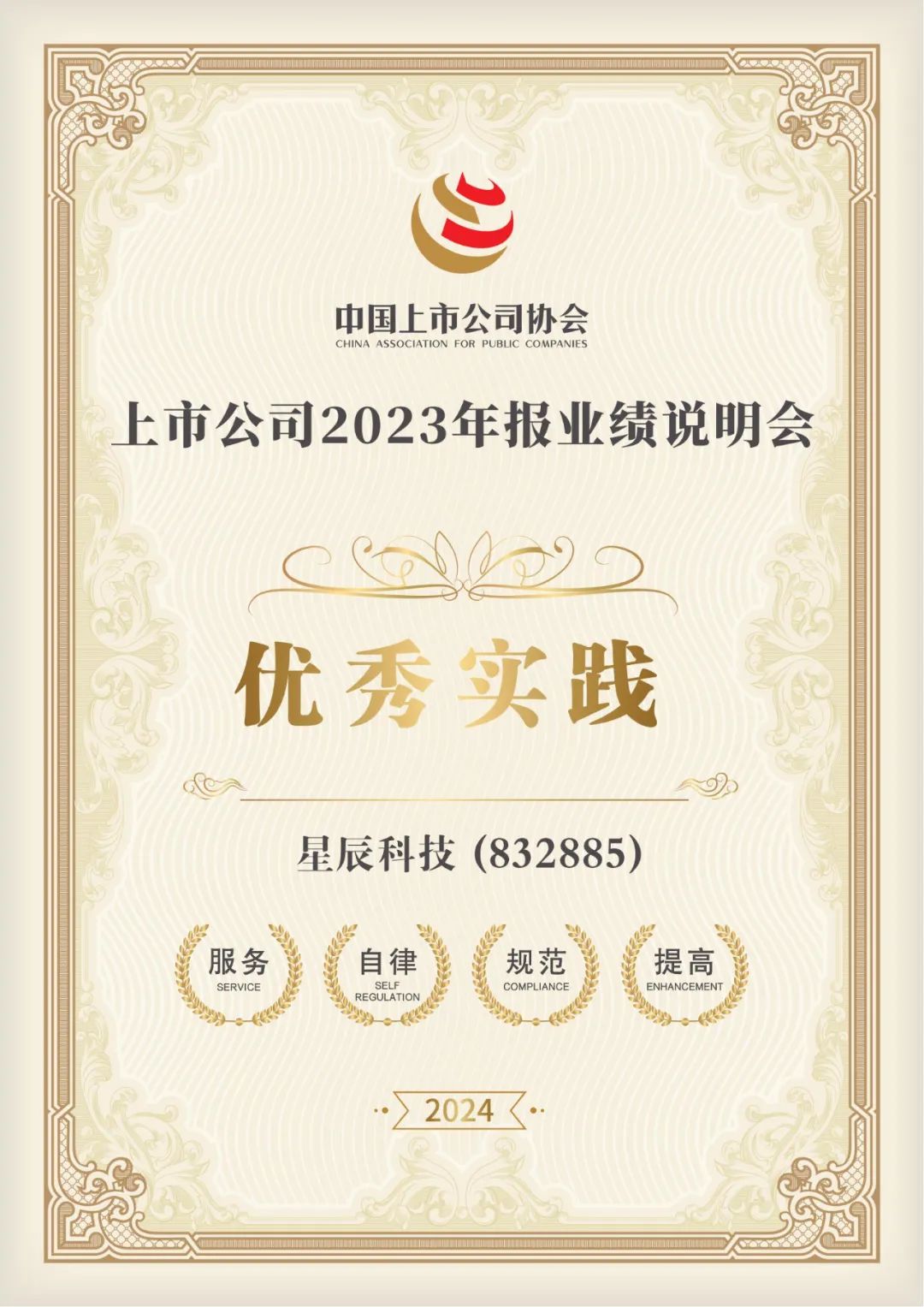这一系列荣誉的获得,是星辰科技多年来坚持创新驱动、不断提升核心竞争力、用心服务和积极回馈广大投资者的结果。未来,我们将继续秉承价值管理和价值传递的理念,努力提升公司业绩和投资价值,为投资者创造更多回报。同时,我们也将继续加强投资者关系管理工作,构建与投资者更加紧密、互信共生的良好生态,共同迎接更加美好的未来!