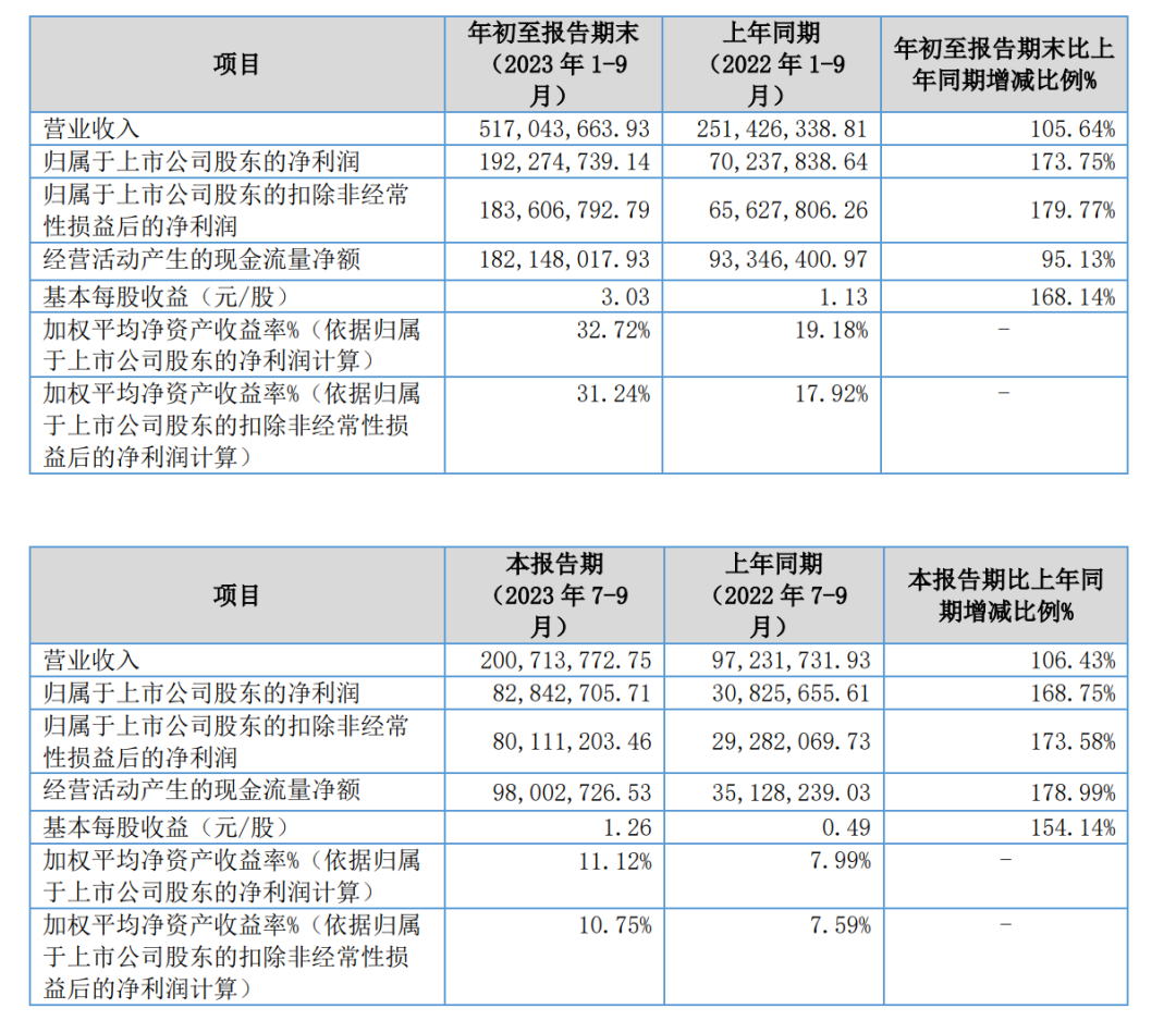 此前,10月26日,锦波生物发布2023 年第三季度报告,2023年1月-9月,锦波生物实现营业收入5.17亿元,同比增长105.64%;归属净利润1.92亿元,同比增长173.75%。其中,第三季度营收2亿元,同比增长106%,净利8284.27万元,同比增长168.5%