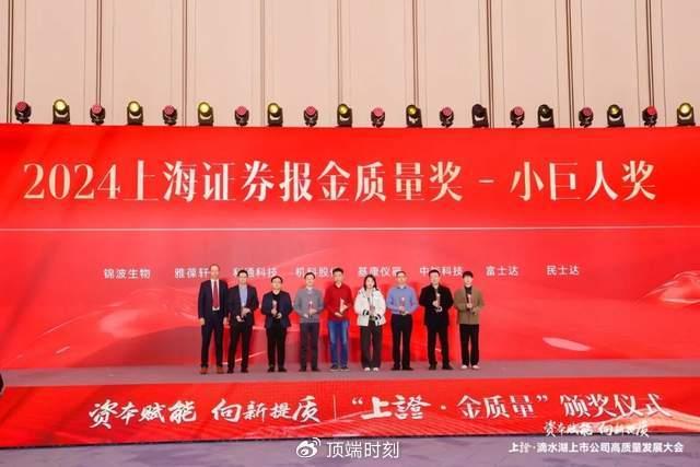 12月27日,由上海证券报与中国证券网主办的“上证·滴水湖上市公司高质量发展大会”暨“上证·金质量”颁奖仪式在上海圆满举办。山西锦波生物医药股份有限公司(以下简称“锦波生物”,股票代码:832982)凭借原始创新的研发能力、发展新质生产力的成果转化、出色的市场表现及在重组人源化胶原蛋白生物新材料领域的突出贡献,荣获“2024上海证券报金质量奖-小巨人奖”。