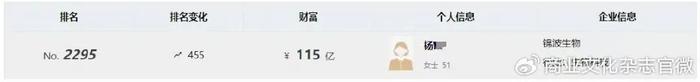 随着股价上涨,锦波生物实控人杨某身家相应提升。截至目前,杨某持有公司58.89%股份,以115亿元身家入选《2025年胡润全球富豪榜》,排名较上年上升455位。
