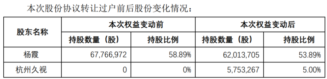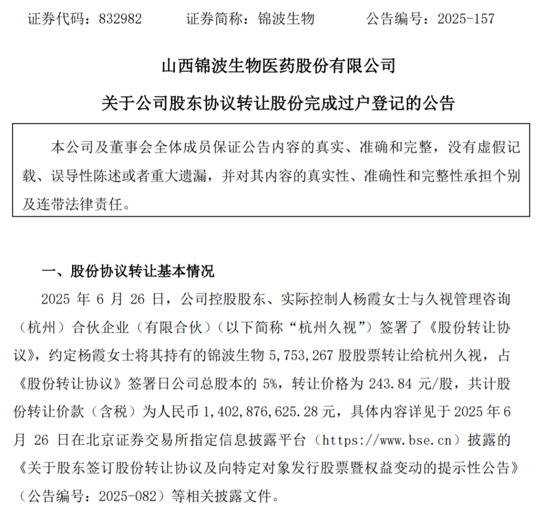 2025年9月15日,锦波生物发布关于公司股东协议转让股份完成过户登记的公告。公司控股股东、实控人杨霞与久视管理咨询(杭州)合伙企业(有限合伙)(以下简称“杭州久视”)的股份转让事项完成过户登记,转让价格为243.84元/股,过户数量为575.33万股,共计股份转让价款为人民币14.03亿元。
