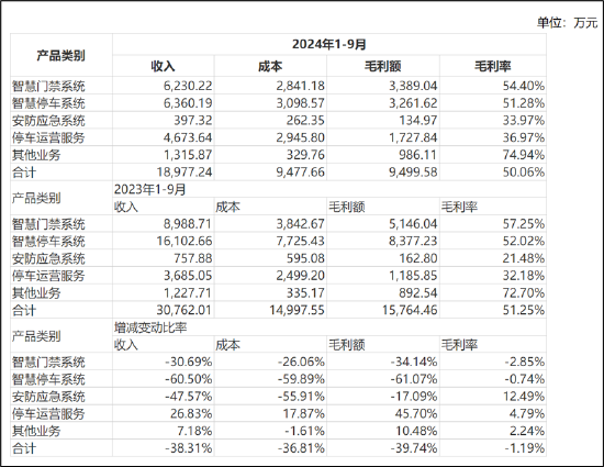 对于业绩大幅变脸,公司称,2024年前三季度,公司业绩下滑主要系终端市场需求不足及宏观经济因素的叠加影响,公司智慧停车、智慧门禁两大主营业务市场表现不及预期。受智慧停车、智慧门禁等产品增量市场需求萎缩的影响,公司2024年前三季度营业收入较上年同期下降38.31%,受此影响公司销售毛利额较上年同期减少6264.88万元,导致公司归母净利润大幅下降,归母净利润金额较上年同期减少6419.05万元。需要指出的是,智慧停车、智慧门禁两大主营业务2024年前三季度收入跌幅分别为30.69%、60.5%。