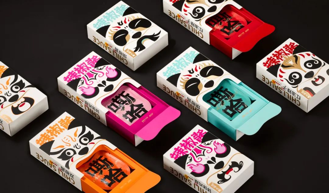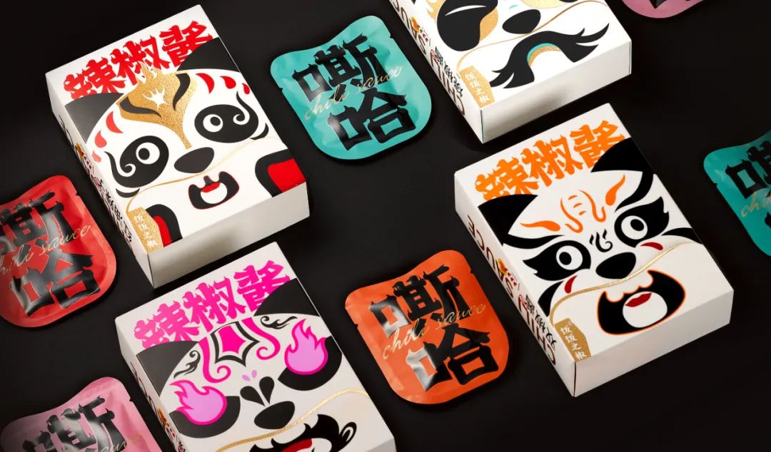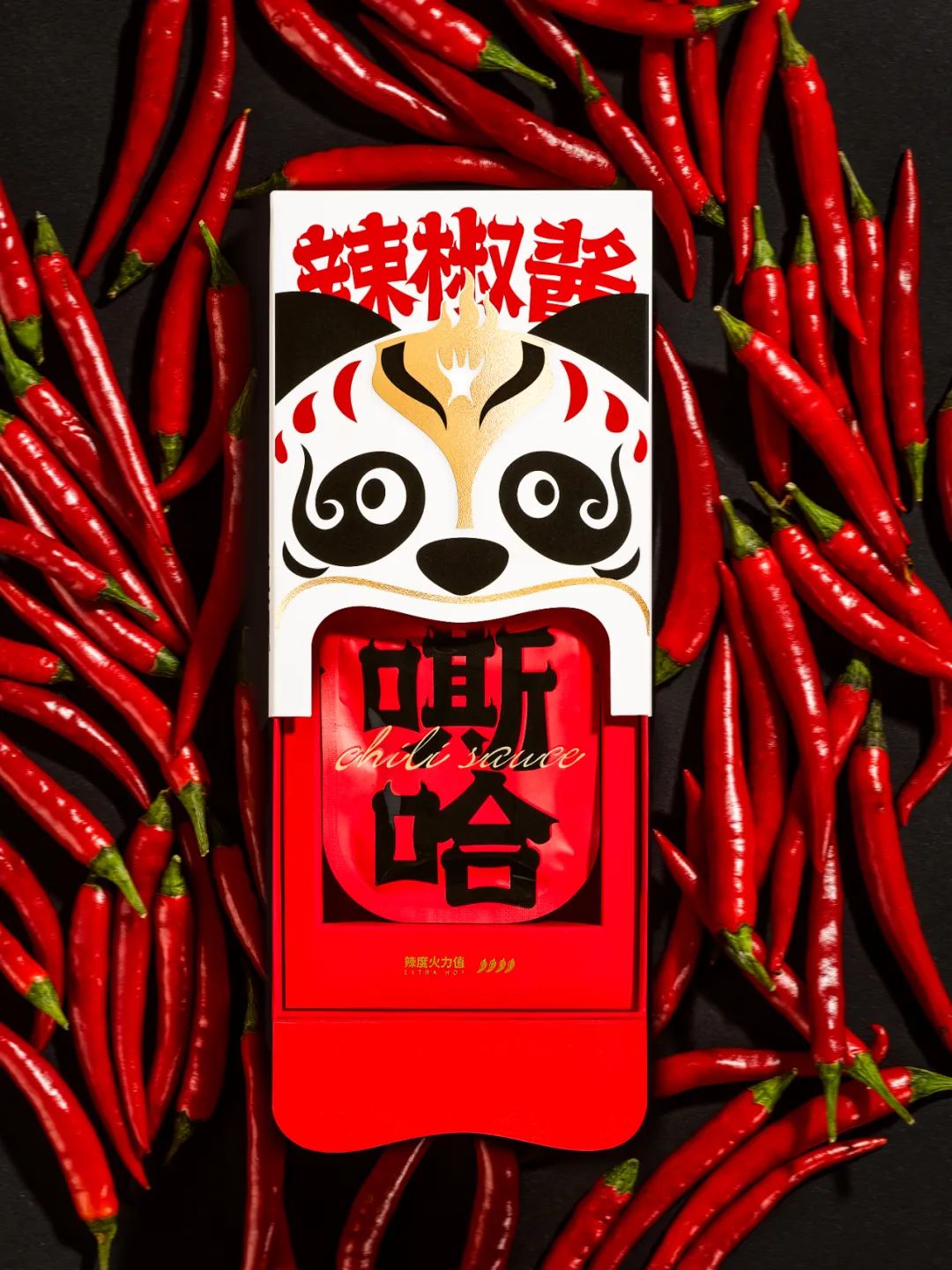 以川剧熊猫的舌头作为辣椒酱的内包装设计,使得打开产品时都有惊喜和愉悦的感觉。袋子上使用吃辣的拟声词“嘶哈”作为视觉符号,直接传达了产品的辣味特性。每款产品独立包装,易于携带,将四川地方文化元素和产品特性有机结合,能够让消费者感受到生活的幸福和乐趣。