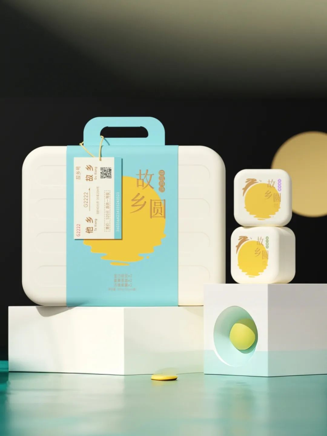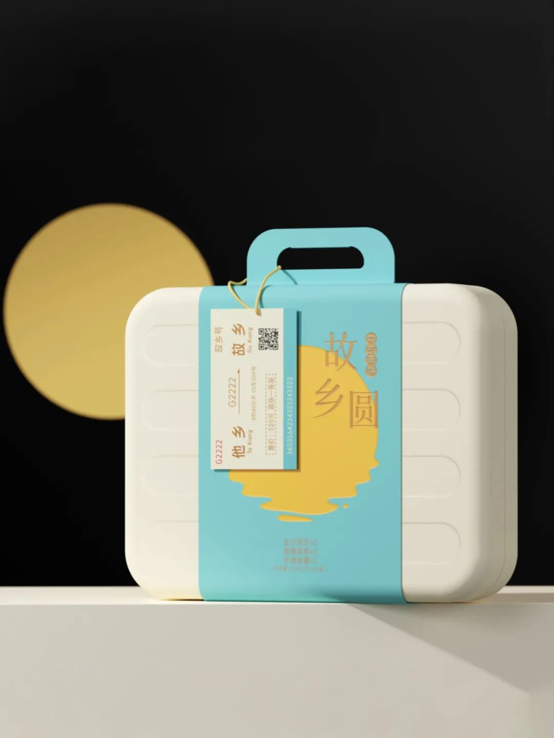 这款中式月饼包装设计背景源自中国传统节日“中秋节”,外型设计以回家的行李箱为基础造型,搭配车票标签,营造着游子踏上归乡旅途的期待与喜悦氛围,整体传递出强烈的思乡之情。