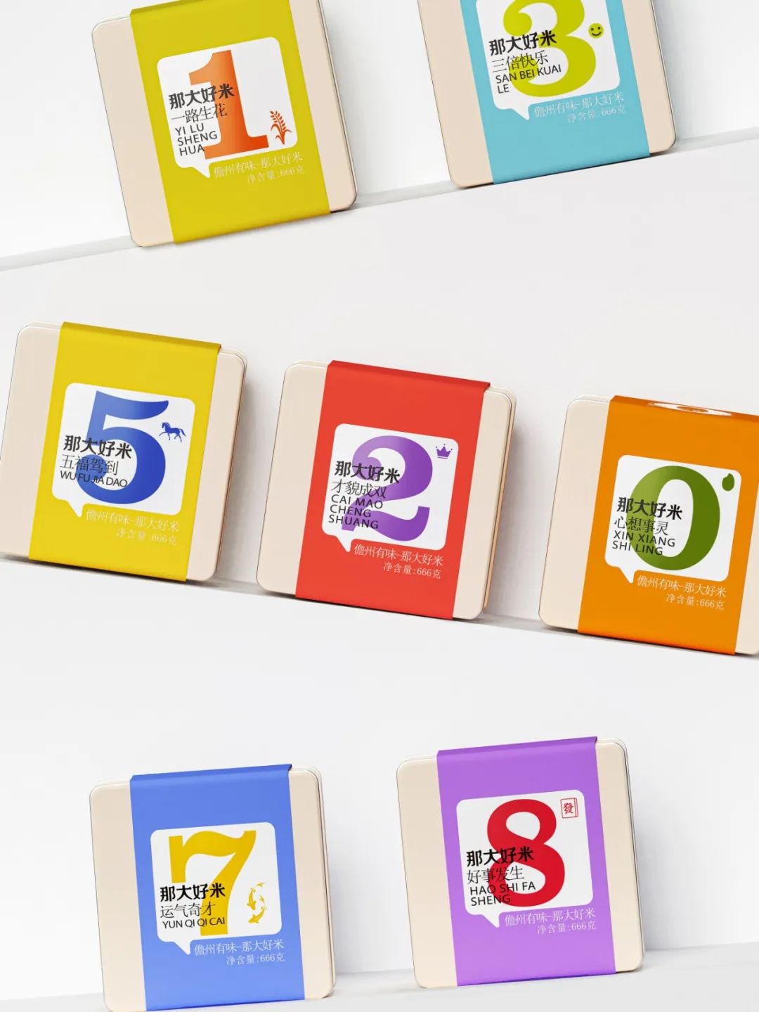 那大好米·数字多巴胺系列中采用明亮、鲜艳、充满活力的颜色,富有活力和乐趣,传达了年轻、快乐和积极的情绪的设计理念,在产品主视觉上突出数字0到9,增加趣味互动感,数字可以自由组合,方便用户根据自己的需要组成纪念日、生日、节日等特殊日期。