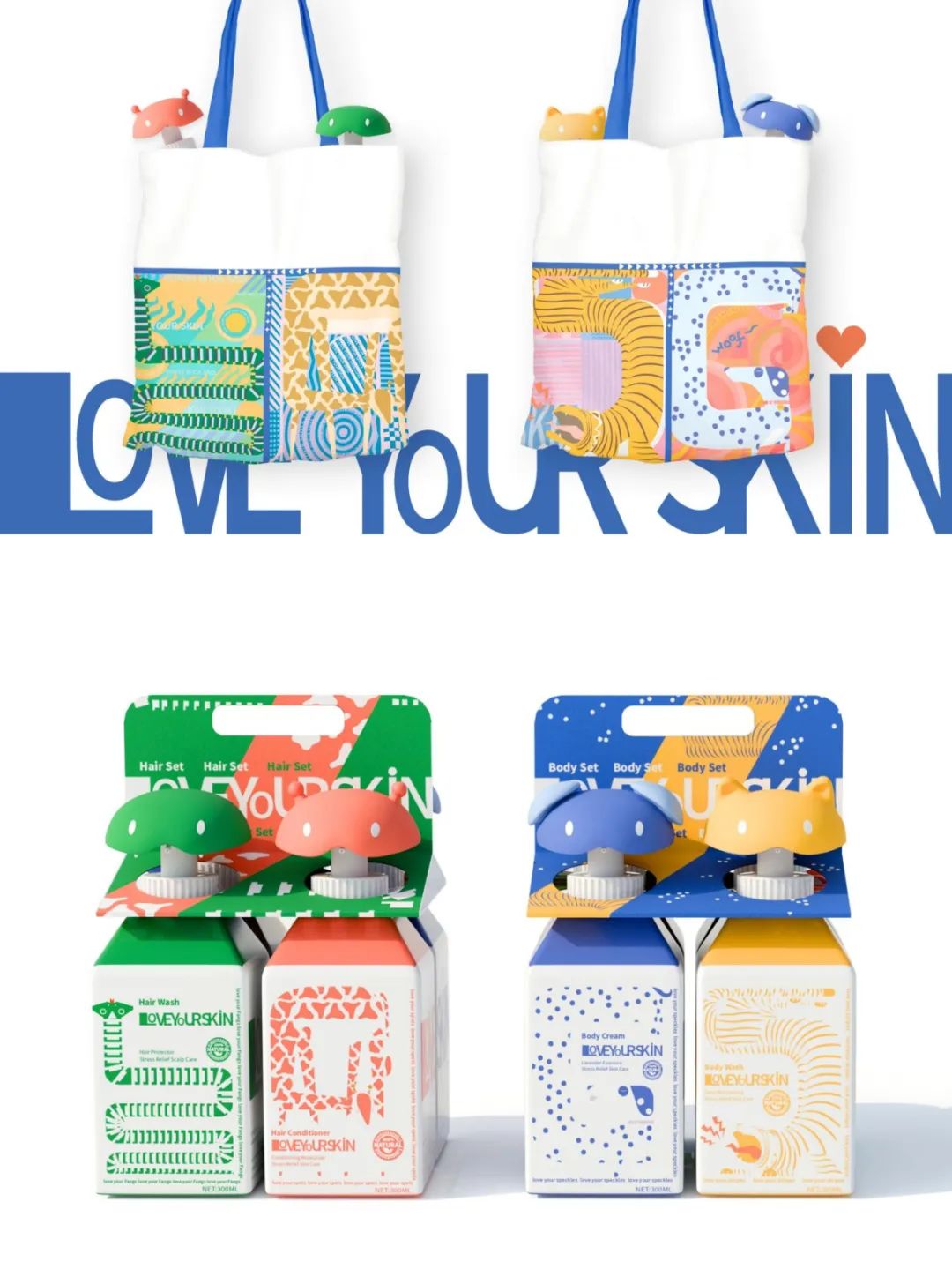 从这个角度出发,将产品的视觉纹理,就如爱自然界中一切存在的纹路质感。纹路是可爱的、斑点是可爱的、色块是可爱的,最核心的想要给消费者传达一种接纳自然,不要有容貌焦虑,快乐沐浴的设计理念。