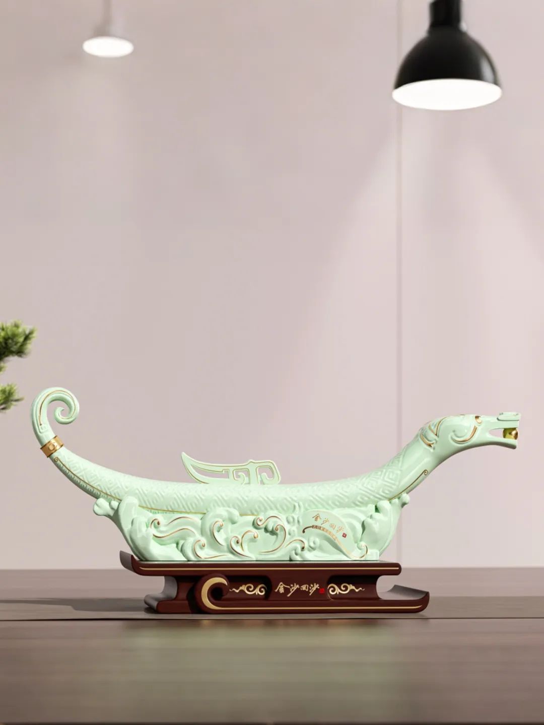 金沙回沙·己巳蛇年生肖酒以蛇衔明珠以报之为概念,以三星堆出土的商铜蛇为载体,以商铜蛇衔明珠作为蛇年生肖酒的器型创意。