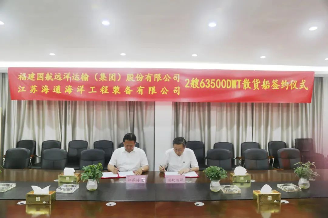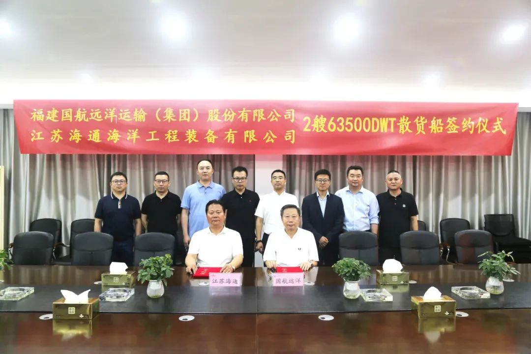 近日,福建国航远洋运输(集团)股份有限公司(以下简称“国航远洋”)与江苏海通海洋工程装备有限公司(以下简称“江苏海通”)在江苏南通举行签订2艘63500DWT散货船签约仪式,国航远洋副总裁韩青,江苏海通董事长金星出席该签约仪式。