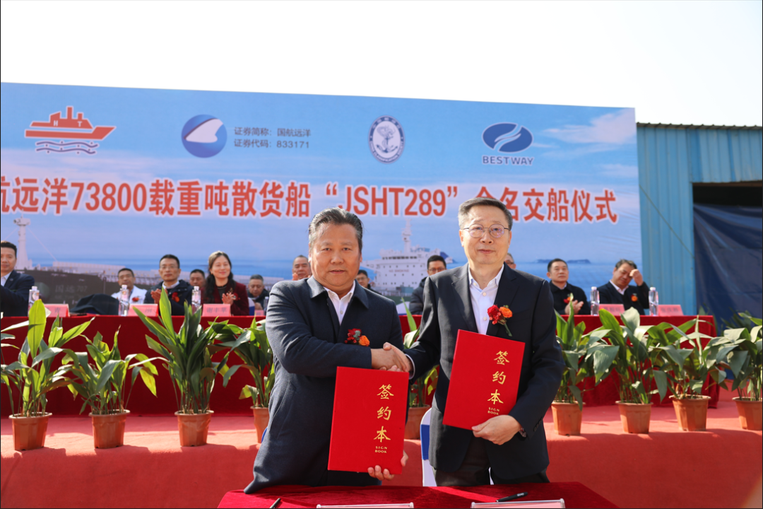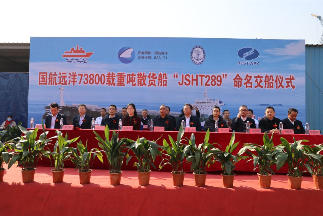 1月6日,国航远洋新造73800DWT甲醇双燃料预留散货船“国远707”轮在江苏南通举行了隆重的交付仪式。江苏海通海洋工程装备有限公司(以下简称“江苏海通”)、上海交通大学、中国船级社南通办事处、上海佳豪船舶工程设计股份有限公司、上海双希海事发展有限公司、玉柴船舶动力股份有限公司、中船温特图尔发动机(上海)有限公司等单位的相关领导嘉宾出席仪式。