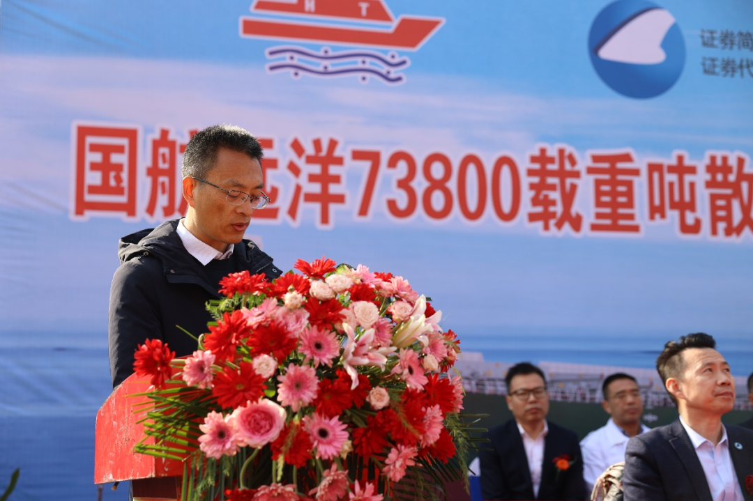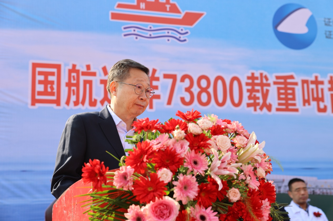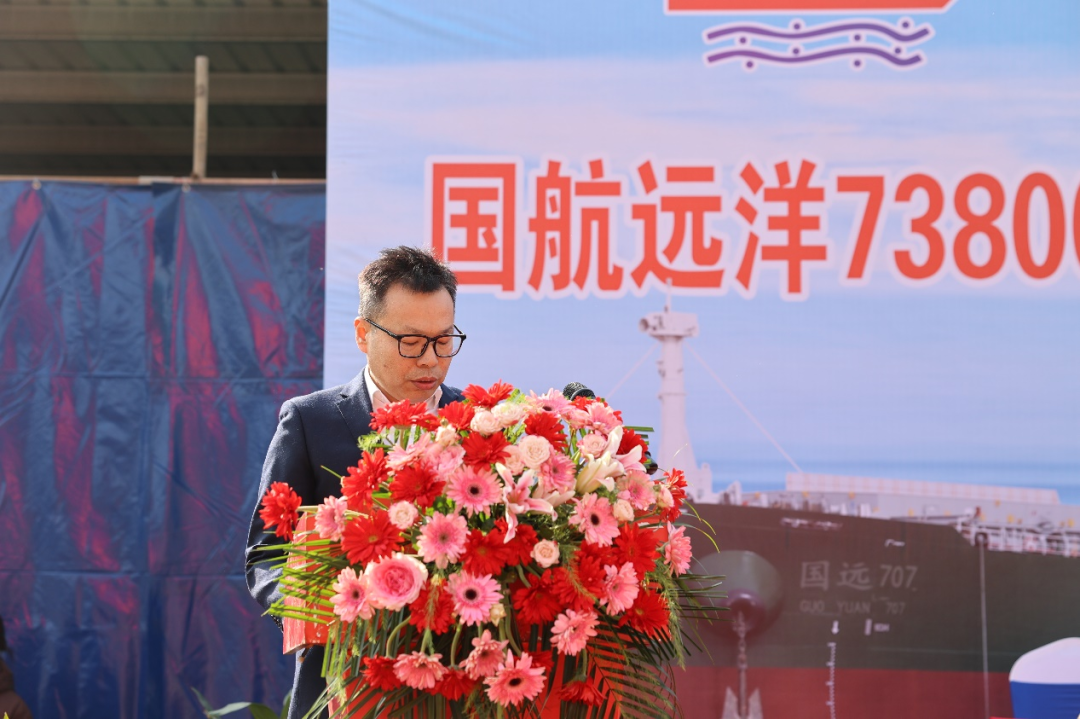 国航远洋副总裁兼总工程师韩青、上海佳豪船舶工程设计股份有限公司副总经理王刚、江苏海通副总经理王鹤飞发表致辞分别代表致辞,三方对“国远707”的成功交付表达了感谢之意和对未来合作展望。