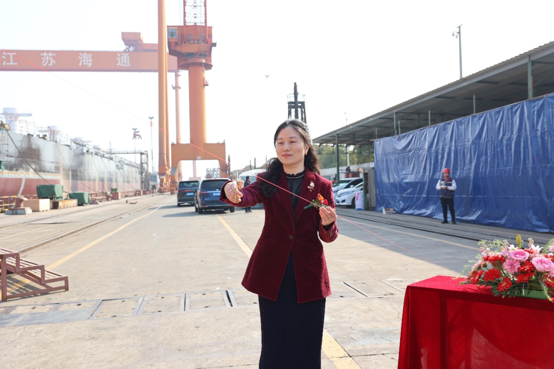上海交通大学ESG研究院特聘研究员谢丰苹女士作为新船教母为新船命名并剪彩进行“掷瓶礼”。愿其承载梦想和希望,驶向辽阔的海洋!乘风破浪,安全航行,满载而归,收获辉煌!