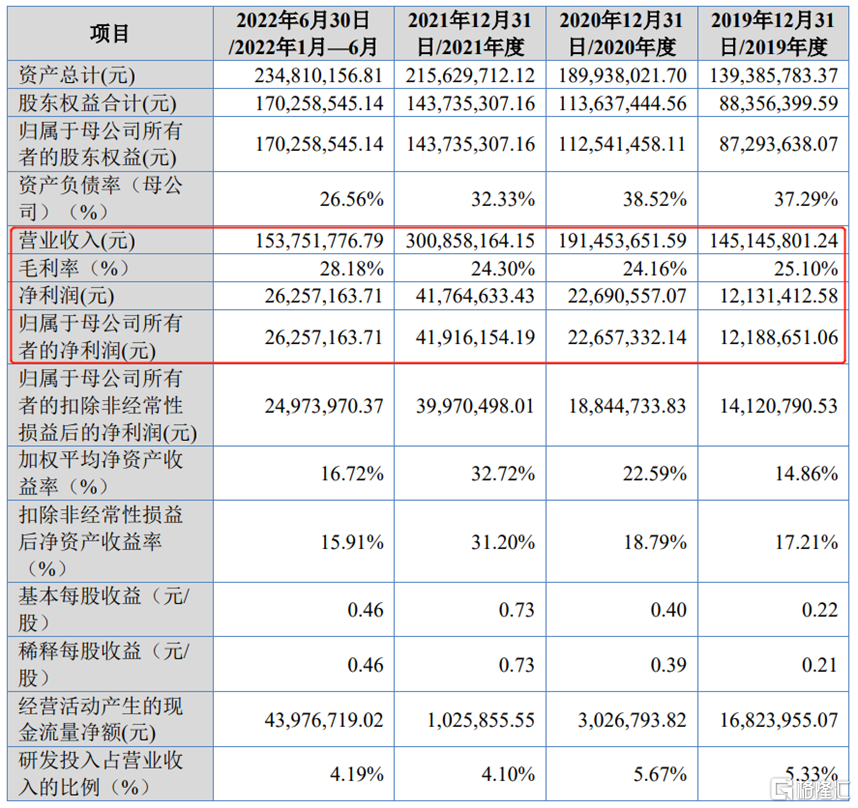 2019年至2022年1-6月各报告期,公司的营业收入分别为1.45亿元、1.91亿元、3.01亿元和1.54亿元,归母净利润分别为1218.87万元、2265.73万元、4191.61万元和2625.71万元,相应的主营业务毛利率分别为25.10%、24.21%、24.13%和28.15%。