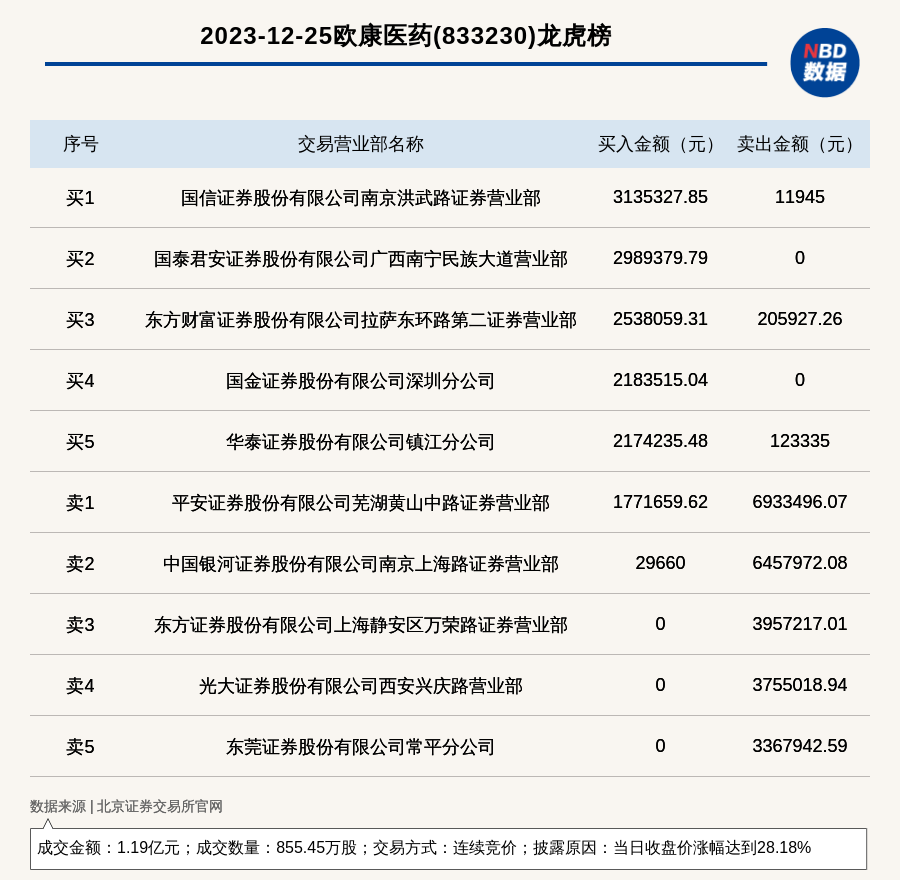 2023年12月25日,北交所上市公司欧康医药(833230,收盘价:15.6元)登上龙虎榜,交易方式是连续竞价,披露原因是当日收盘价涨幅达到28.18%,成交数量855.45万股,成交金额1.19亿元。买一席位为国信证券股份有限公司南京洪武路证券营业部,买入313.53万元;卖一席位为平安证券股份有限公司芜湖黄山中路证券营业部,卖出693.35万元。