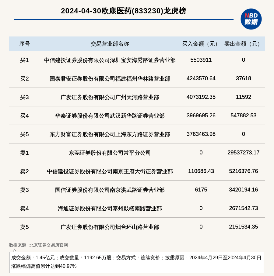 2024年4月30日,北交所上市公司欧康医药(833230,收盘价:12.89元)登上龙虎榜,交易方式是连续竞价,披露原因是2024年4月29日至2024年4月30日涨跌幅偏离值累计达到40.97%,成交数量1192.65万股,成交金额1.45亿元。买一席位为中信建投证券股份有限公司深圳宝安海秀路证券营业部,买入550.39万元;卖一席位为东莞证券股份有限公司常平分公司,卖出2953.73万元。
