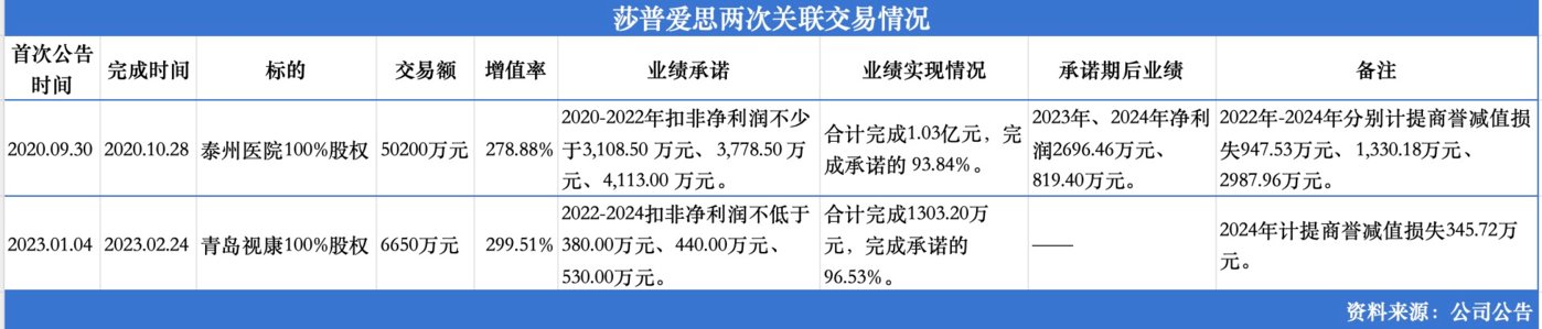 2020年9月30日,公司公告拟溢价278.88%以5.02亿元现金购买林氏兄弟实际控制的泰州市妇女儿童医院有限公司(以下简称“泰州医院”);2023年1月4日,莎普爱思再扔出购买关联资产的公告,公司拟溢价299.51%以6650万元收购青岛视康眼科医院有限公司(以下简称“青岛视康”)100%股权,林氏兄弟的堂哥林长剑通过上海芳芷持有青岛视康20%股权,构成关联交易。