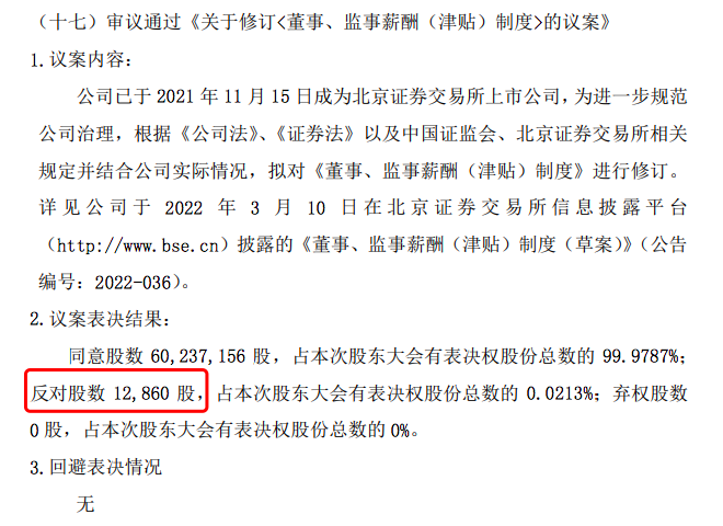 挖贝君注意到,17项议案最终均获通过,但均有股东投出反对票。如《关于修订的议案》表决结果是:同意股数60,237,156股,占本次股东大会有表决权股份总数的99.9787%;反对股数12,860股,占本次股东大会有表决权股份总数的0.0213%。