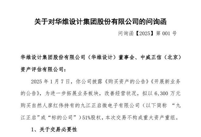 据华维设计披露的《购买资产的公告》《开展新业务的公告》,为进一步拓展业务板块,改善经营状况,拟以6300万元购买自然人廖红伟持有的九江正启微电子有限公司(简称“九江正启”或“标的公司”)51%股权,本次交易不构成重大资产重组。