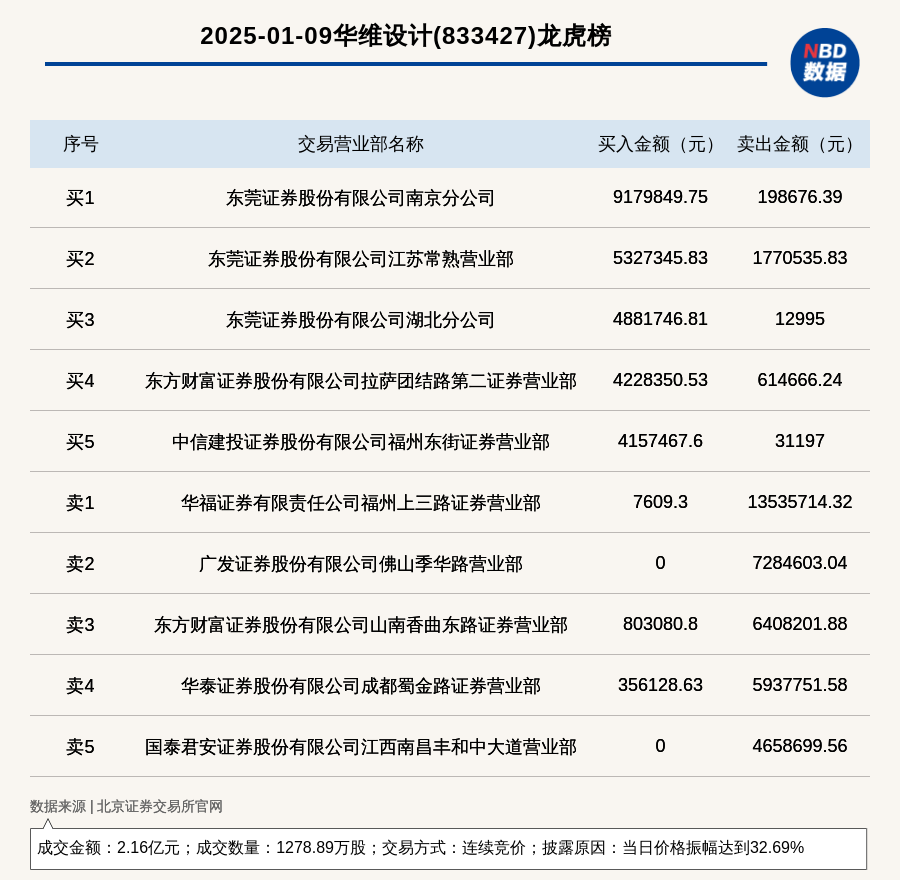 每经讯,2025年1月9日,北交所上市公司华维设计(833427,收盘价:16元)登上龙虎榜,交易方式是连续竞价,披露原因是当日价格振幅达到32.69%,成交数量1278.89万股,成交金额2.16亿元。买一席位为东莞证券股份有限公司南京分公司,买入917.98万元;卖一席位为华福证券有限责任公司福州上三路证券营业部,卖出1353.57万元。