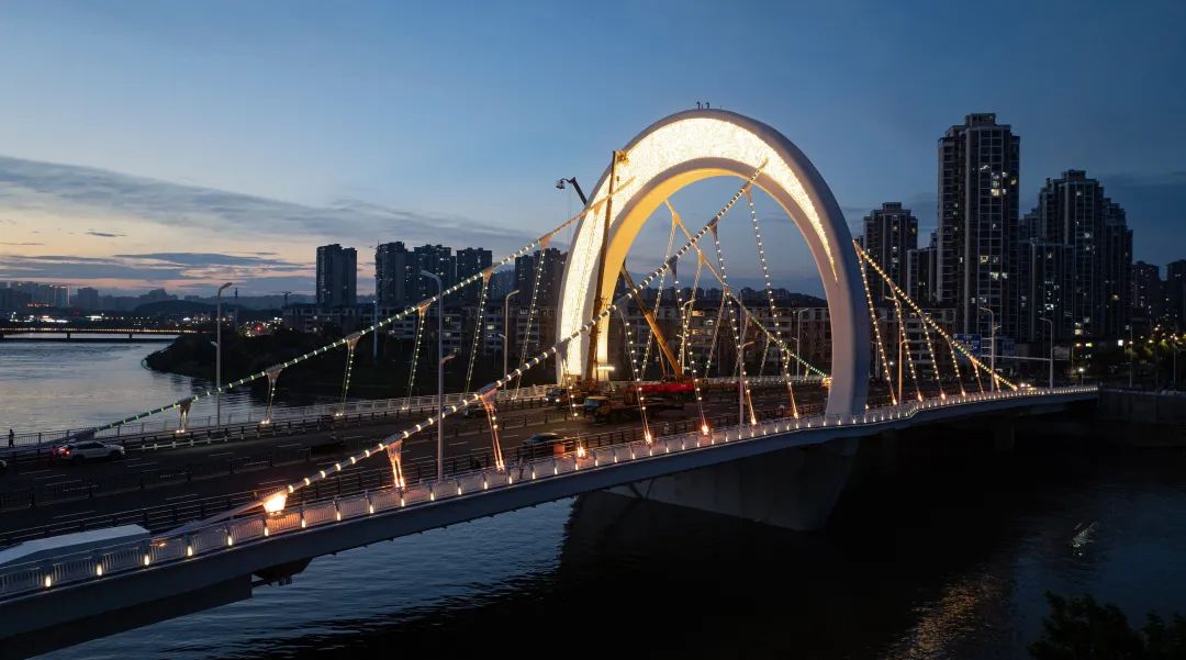 桥梁景观照明设计以“月升袁河,星光寰宇”为主题,旨在将秀月大桥打造成为一座具有标志性的城市景观桥梁,充分展现宜春市“月亮之都”的独特魅力,并弘扬悠久的月亮文化。