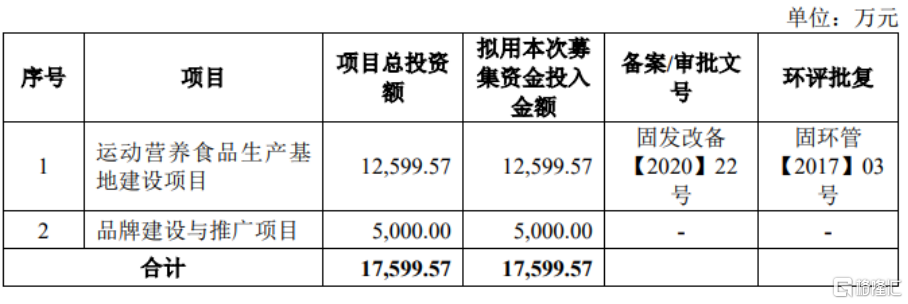 本次IPO拟募资1.76亿元,主要用于运动营养食品生产基地建设项目、品牌建设与推广项目。