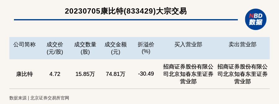 每经讯,2023年7月5日,北交所上市公司康比特(833429,收盘价:6.79元)发生一笔大宗交易,成交价4.72元/股,成交数量15.85万股,成交金额74.81万元,折价30.49%。买入营业部是招商证券股份有限公司北京知春东里证券营业部,卖出营业部是招商证券股份有限公司北京知春东里证券营业部。