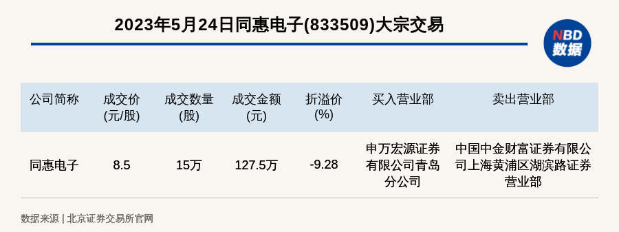 每经讯,2023年5月24日,北交所上市公司同惠电子(833509,收盘价:9.37元)发生一笔大宗交易,成交价8.5元/股,成交数量15万股,成交金额127.5万元,折价9.28%。买入营业部是申万宏源证券有限公司青岛分公司,卖出营业部是中国中金财富证券有限公司上海黄浦区湖滨路证券营业部。