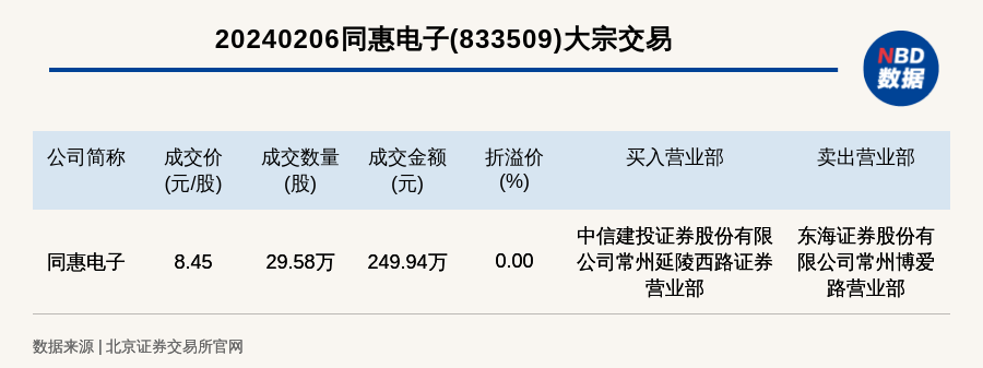 2024年2月6日,北交所上市公司同惠电子(833509,收盘价:8.45元)发生一笔大宗交易,成交价8.45元/股,成交数量29.58万股,成交金额249.94万元,为平价交易。买入营业部是中信建投证券股份有限公司常州延陵西路证券营业部,卖出营业部是东海证券股份有限公司常州博爱路营业部。