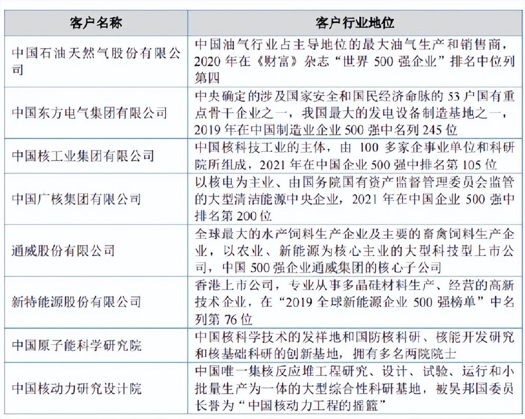 公司经过不断发展,已经能够针对不同客户的差异化需求最大限度的实现定制化产品快速交付。凭借卓越的技术创新实力、良好的产品品质、丰富的行业经验和快速响应的服务能力,公司的产品和服务得到了核能、新能源、石油化工、环保等领域众多客户的青睐与认可。公司多年来为国内客户提供了大量优质的压力容器产品,目前已经是中国核工业集团有限公司、中国东方电气集团有限公司、通威股份有限公司、新特能源股份有限公司、中国原子能科学研究院、中国核动力研究设计院等大型国企、上市公司、科研单位的合格供应商。