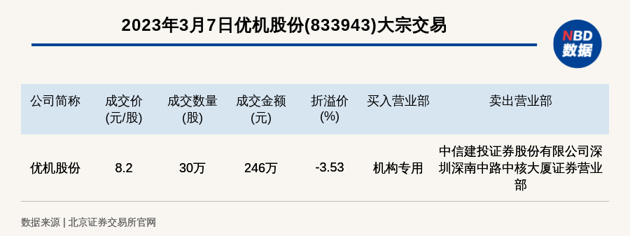 每经讯,2023年3月7日,北交所上市公司优机股份(833943)发生一笔大宗交易,成交价8.2元/股,成交数量30万股,成交金额246万元,折价3.53%。买入营业部是机构专用,卖出营业部是中信建投证券股份有限公司深圳深南中路中核大厦证券营业部。
