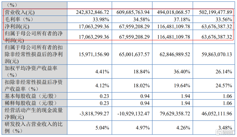 2019年至2022年1-6月各报告期,公司的营业收入分别为5.02亿元、4.94亿元、6.10亿元和2.43亿元,归母净利润分别为6367.64万元、1.16亿元、6795.92万元和1706.33万元,相应的毛利率分别为33.56%、37.18%、34.58%和33.98%。